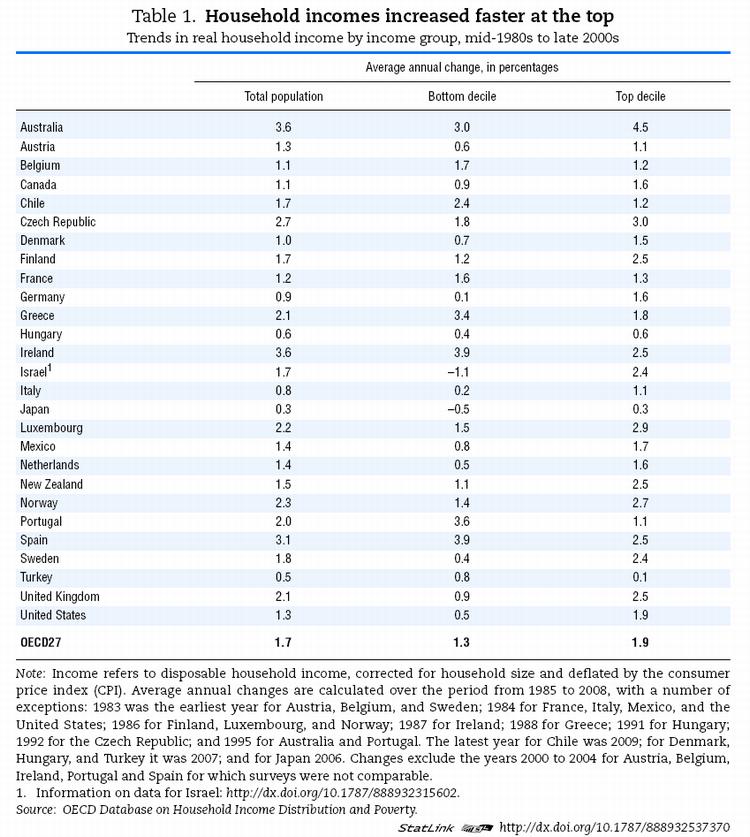 Over the two decades prior to the onset of the global economic crisis, real disposable household incomes increased by an average 1.7% a year in OECD countries. In a large majority of them, however, the household incomes of the richest 10% grew faster than those of the poorest 10%, so widening income inequality. Differences in the pace of income growth across household groups were particularly pronounced in some of the English-speaking countries, some Nordic countries, and Israel. |1| In Israel and Japan, the real incomes of those at the bottom of the income ladder actually fell compared with the mid-1980s (Table 1).