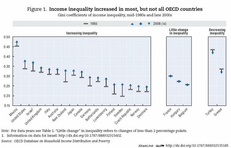 The Gini coefficient, a standard measure of income inequality that ranges from 0 (when everybody has identical incomes) to 1 (when all income goes to only one person), stood at an average of 0.29 in OECD countries in the mid-1980s. By the late 2000s, however, it had increased by almost 10% to 0.316. Significantly, it rose in 17 of the 22 OECD countries for which long-term data series are available (Figure 1), climbing by more than 4 percentage points in Finland, Germany, Israel, Luxembourg, New Zealand, Sweden, and the United States. Only Turkey, Greece, France, Hungary, and Belgium recorded no increase or small declines in their Gini coefficients.