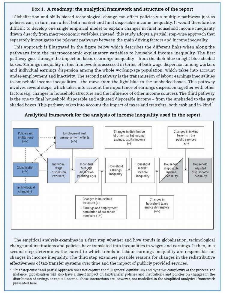 On the basis of the analytical framework set out in the box above, this report addresses inequality in three parts. Part I looks at whether and how trends in globalisation, technological change and institutions and policies translated into inequalities in wages and earnings. The focus is on identifying the main driving forces of increased wage and earnings inequality within, rather than between, countries. Part II analyses what comprises the transition from earnings to income inequality, looking at such factors in household earnings inequality as the impact of changing family structures as well as other income sources that contribute to households' disposable income. Part III analyses the possible reasons for changes in the impact of tax and transfer systems in OECD countries. It also looks at the impact of publicly provided services, updating and extending the work presented in OECD (2008). Finally, it discusses the tax policy implications of recent top-income trends.