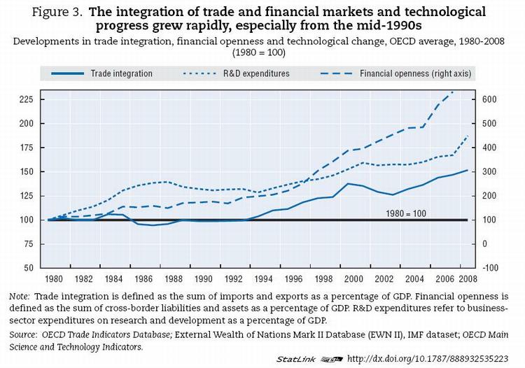 Over the past decades, OECD countries underwent significant structural changes, driven by their closer integration into the global economy and to rapid technological progress. These changes often brought highly skilled workers greater rewards than low-skilled ones and thus affected the way earnings from work were distributed. The rising gap between the earnings of the highly skilled and those of the low-skilled springs from several factors. First, a rapid rise in the integration of trade and financial markets generated a relative shift in labour demand in favour of highly skilled workers. Second, technological progress shifted production technologies in both industries and services in favour of skilled labour. These structural changes got underway in the early 1980s and accelerated from the mid-1990s (Figure 3). |7|