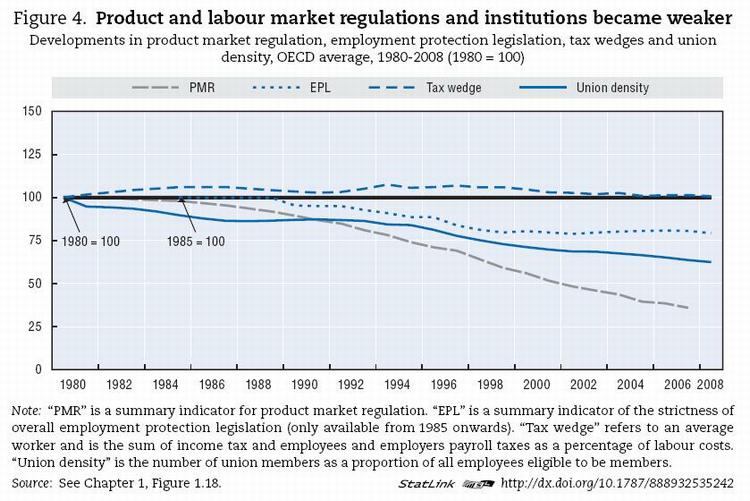 In the two decades from 1980 to 2008, most OECD countries carried out regulatory reforms to strengthen competition in the markets for goods and services and to make labour markets more adaptable. All countries, for example, significantly relaxed anticompetitive product-market regulations and many also loosened employment protection legislation (EPL) for workers with temporary contracts. Minimum wages also declined relatively to median wages in a number of countries between the 1980s and 2008. Wage-setting mechanisms also changed: the share of union members among workers fell across most countries, although the coverage of collective bargaining generally remained rather stable over time. A number of countries cut unemployment benefit replacement rates and, in an attempt to promote employment among low-skilled workers, some also reduced taxes on labour for low-income workers (Figure 4).