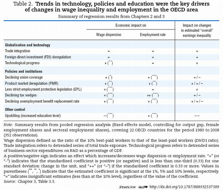 Finally, the results from the study highlight the central role of education. The rise in the supply of skilled workers considerably offset the increase in wage dispersion associated with technological progress, regulatory reforms and institutional changes. The upskilling of the labour force also had a significant impact on employment growth. The growth in average educational attainment thus appears to have been the single most important factor contributing not only to reduced wage dispersion among workers but also to higher employment rates. On the basis of these results, the evolution of earnings inequality across OECD countries over the past few decades could be viewed mainly as the difference between the demand for and supply of skills or, as neatly summarised by Tinbergen (1975), the outcome of a "race between education and technology" (Table 2).