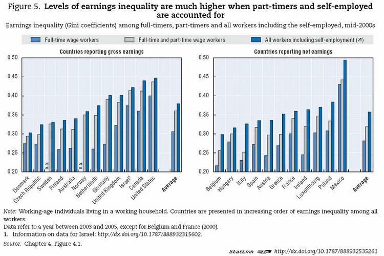 On average across the OECD, the share of part-time employment in total employment increased from 11% in the mid-1990s to about 16% by the late 2000s, with the strongest increases observed in some European countries - Germany, Ireland, the Netherlands, and Spain (OECD, 2010). While offering suitable employment opportunities for traditionally under-represented groups, part-time work also contributed to widening gaps in the distribution of wages. Indeed, adding part-time workers to the full-time gross earnings distribution increases the Gini coefficient of inequality by more than five percentage points on average and by another two points when self-employed workers are also included (Figure 5).