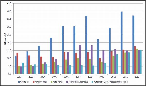 The leading U.S. import item from Mexico is crude petroleum oil. |29| The value of crude oil imports from Mexico in 2012 totaled $37.3 billion, more than two times the value of auto imports ($17.7 billion), the second leading import item. As shown in Figure 5, crude petroleum oil imports from Mexico are considerably higher than other top imports from Mexico, and have become more significant over the past 10 years as a percentage of trade.