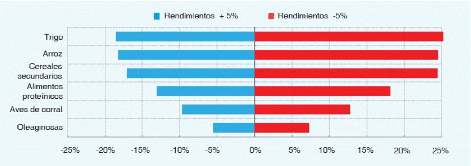 El análisis incluido en el informe Perspectivas de la agricultura 2011-2020 de la Organización para la Cooperación y el Desarrollo Económicos (OCDE) y la FAO confirma que las fluctuaciones de la producción debidas al rendimiento (ocasionadas normalmente por las condiciones meteorológicas) ocurridas en los principales países exportadores de cultivos han sido una fuente fundamental de la volatilidad de los precios internacionales. En dicho informe también se demuestra la incertidumbre de las previsiones sobre los precios y se sugiere que el riesgo de que aumenten los precios es mayor que el riesgo de que disminuyan, y se espera que las variaciones del rendimiento relacionadas con las condiciones meteorológicas se conviertan en una causa todavía más determinante de la volatilidad de los precios en el futuro. El siguiente gráfico indica el efecto en los precios de los productos alimenticios (en porcentaje) ocasionado por un aumento o disminución del rendimiento del 5 %. Los resultados muestran que los efectos en los precios de todos los grupos de productos serían de mayor magnitud en el caso de una disminución del rendimiento que en el caso de un aumento del mismo.
