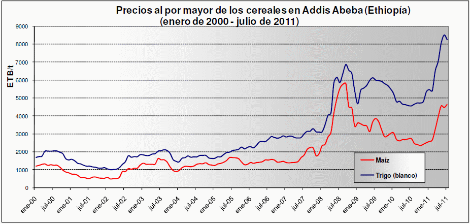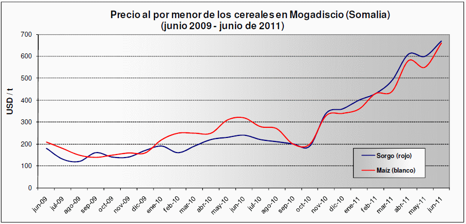 En junio de 2011 el maíz y el sorgo rojo se comercializaba en el mercado al por menor de Mogadiscio a los precios récord de 660 USD y 670 USD por tonelada respectivamente, lo que supone un aumento respectivo del 106 % y el 180 % anual. En Etiopía, los precios al por mayor del trigo en el mercado de Addis Abeba han alcanzado el valor máximo de 8 500 birr (ETB) por tonelada, lo que supone un 85 % más que un año antes. De igual modo, en junio de 2011 los precios del maíz alcanzaron el valor récord de 450 USD por tonelada en Nairobi (Kenya), es decir, un 55 % más que en junio de 2010.