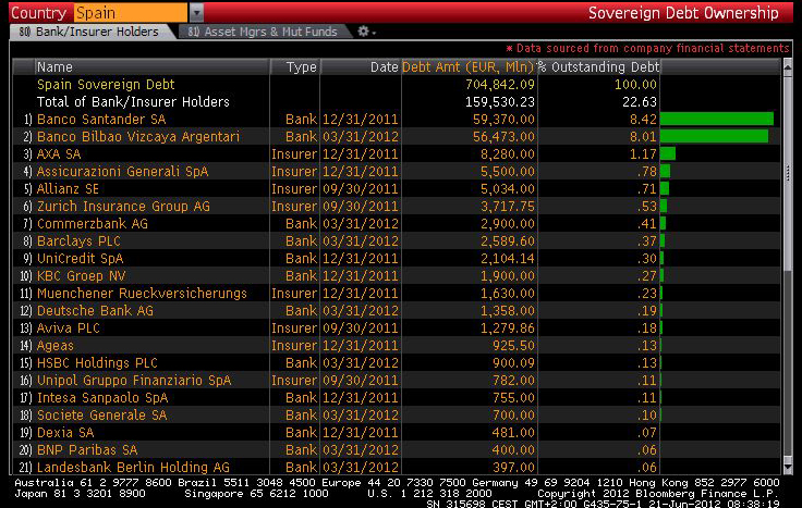 Según los datos de Bloomberg, el grupo presidido por Emilio Botín tiene deuda española por casi 60.000 millones de euros, mientras que la institución liderada por Francisco González tiene una posición acreedora de cerca de 56.500 millones. El banco con sede de Bilbao matiza que su último dato oficial es de 52.800 millones, cantidad que incluye cualquier tipo de exposición a riesgo de impago.