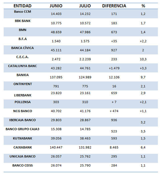 A continuación se acompaña una tabla con el nombre de la entidad, el importe de los depósitos de la clientela expresados en millones de euros en junio y julio, la diferencia en millones de euros entre estos meses y su expresión en porcentaje, negativo, excepto cuando se indica lo contrario.