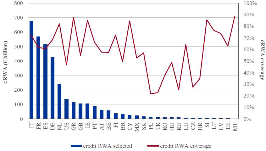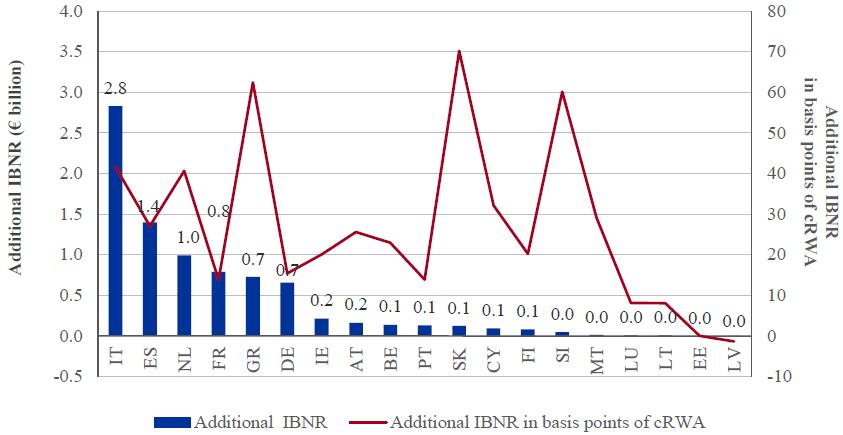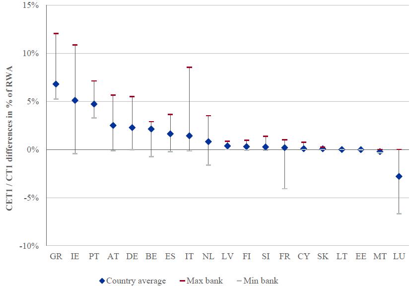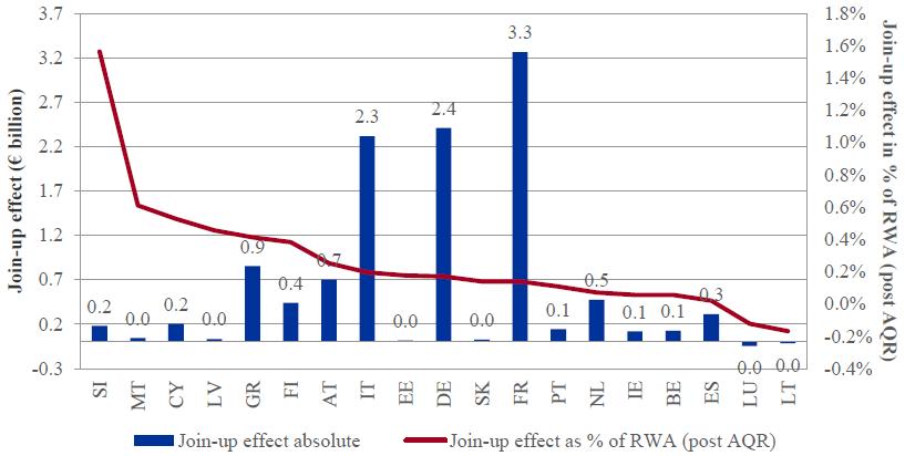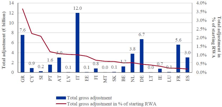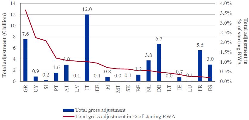 Click to enlargeThe overall comprehensive assessment shortfall is shown again in Figure 4, split by country of participating bank. It is presented in terms of country-level RWA, i.e. reflecting the significance of the shortfall relative to the size of the banks included in the exercise and showing the direct impact on banks' CET1 ratio.