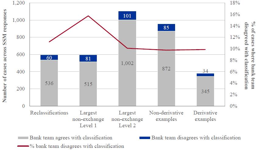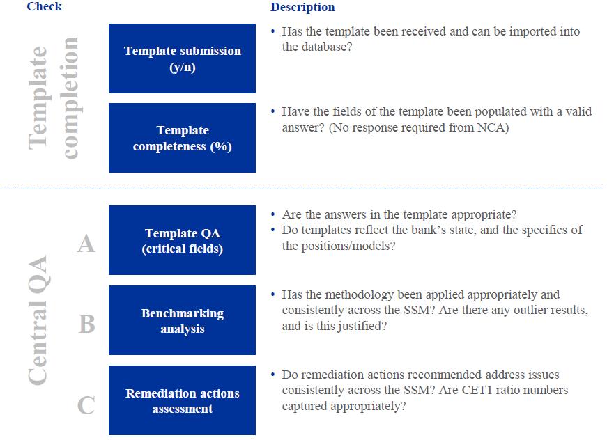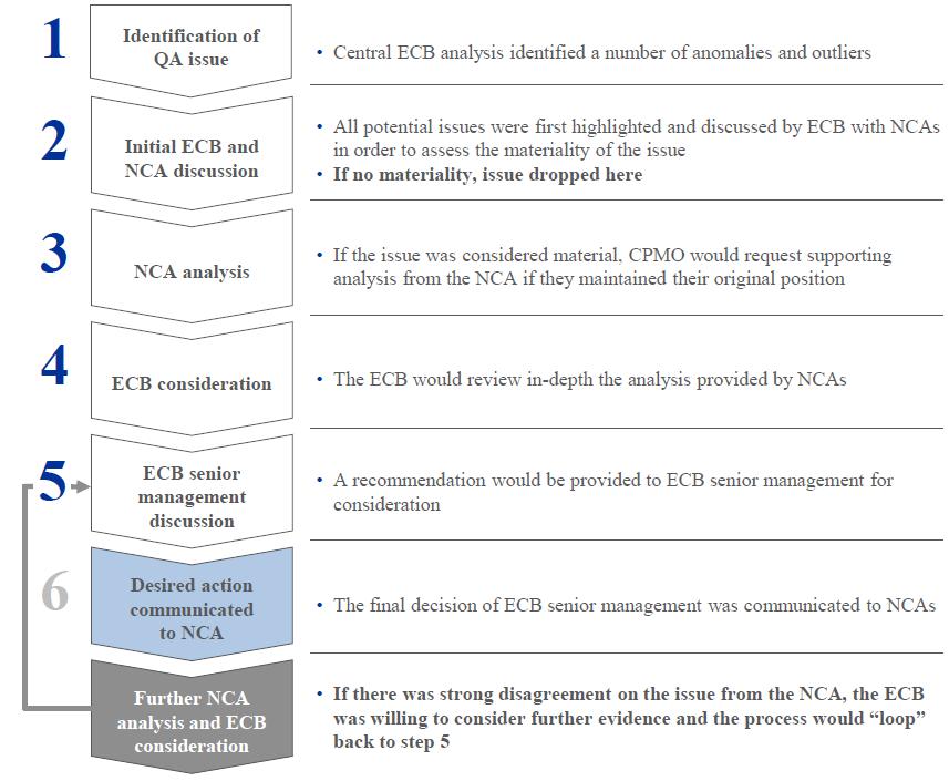 In order to maintain consistency and equal treatment across both the AQR and stress test, central ECB teams independently performed quality assurance on the work of the banks and NCAs. The ECB was in close contact with NCAs, responding to over 8,000 methodology and process questions. The ECB reviewed and challenged outcomes from an SSM-wide perspective using comparative benchmarking, as well as engaged with NCAs to investigate specific issues that arose. Over 100 experts from the ECB along with external support professionals were involved in this quality assurance activity.