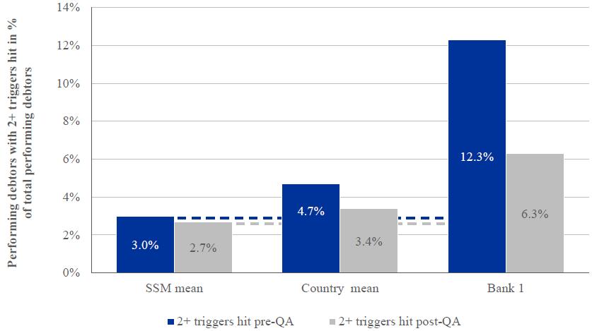 64. The simplified EBA ITS approach differs from the full EBA ITS definition mostly with regard to forbearance marking. As, at the beginning of the exercise, participating banks had not fully adopted these new guidelines, the application of the full EBA ITS definition was technically not feasible. Note, however, that forborne NPE as defined in the EBA ITS was used as a minimum impairment trigger in the AQR. Through this route the two definitions (EBA ITS and simplified EBA ITS) are similar for those asset classes in which a credit file review was performed. [Volver]