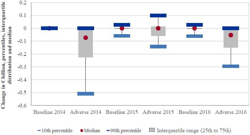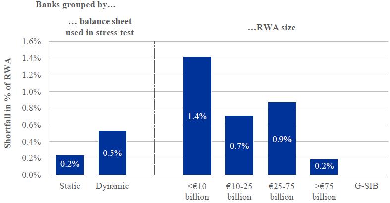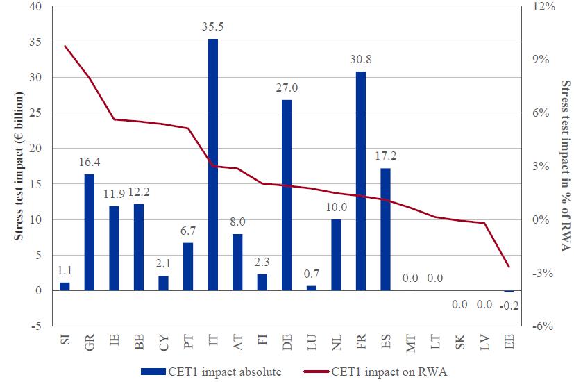Under the adverse scenario, the banks' aggregate available capital is projected to be depleted by €215.5 billion (22% of capital held by participating banks) and risk weighted assets (RWA) to increase by about €860 billion by 2016; including this as a capital requirement at the threshold level brings the total capital impact to €262.7 billion in the adverse scenario.