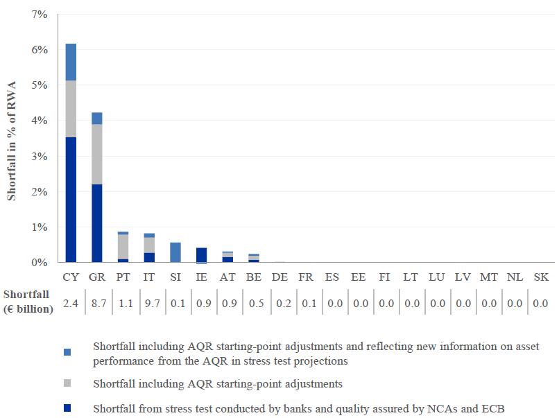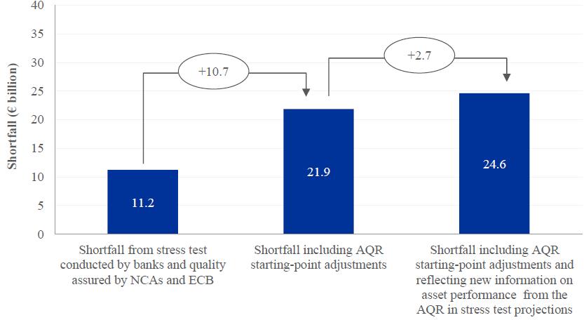 The €24.6 billion shortfall can be disaggregated into three components. The amount of shortfall that arose from the stress test conducted by the banks and quality assured by the ECB was €11.2 billion before making any adjustments due to AQR results and after accounting for all existing capital buffers as of 31 December 2013. The inclusion of the reduction in starting-point available capital due to AQR adjustments increases this shortfall to €21.9 billion. Finally, the reflection of the new information on asset performance learned through the AQR in the stress test projections resulted in the full shortfall of €24.6 billion. These impacts are illustrated in Figure 3.