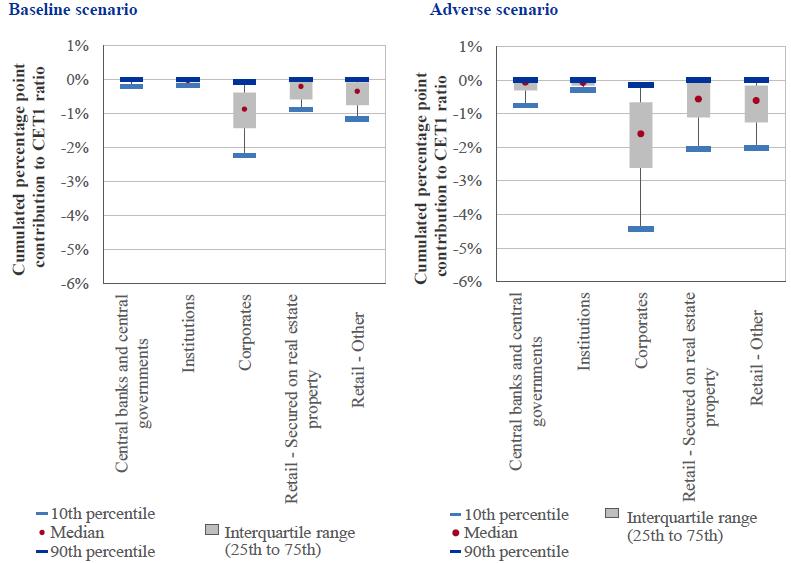 Figure 2 Comprehensive assessment median projected adverse scenario reduction in capital ratio by country of participating bank