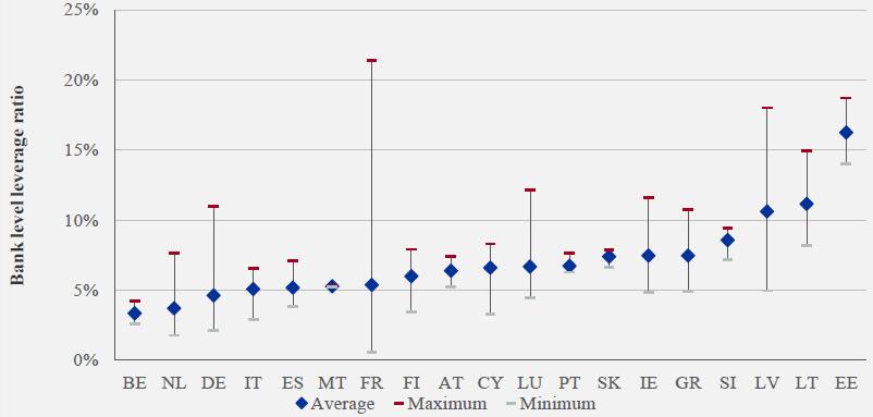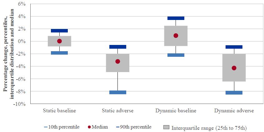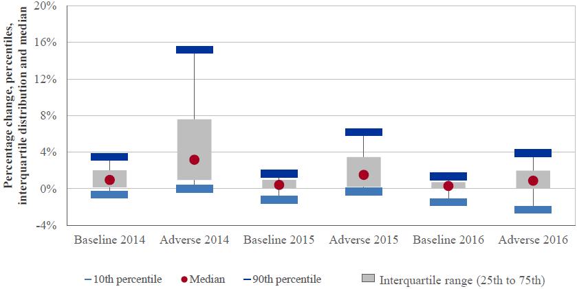 This capital impact leads to a decrease of the CET1 ratio for the median participating bank by 4.0 percentage points from 12.4% to 8.3% in 2016. The reduction in the median CET1 ratio projected for banks in each country is shown in Figure 2.