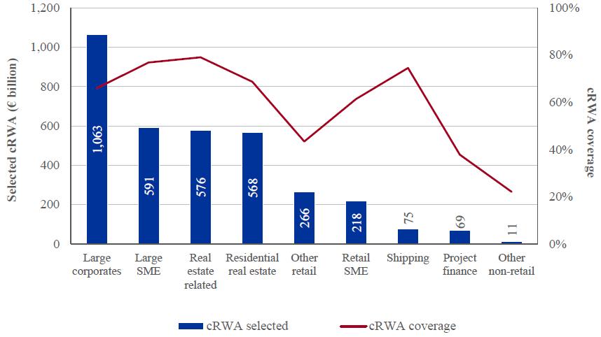 32. In order for a portfolio to be material, it had to individually account for more than 2% of the bank's cRWA and it had to be defined at the correct level of granularity, i.e. be defined as one of the following asset classes within a single country exposure: sovereign, supra-national, retail SME, retail other, residential real estate, state-owned enterprises, shipping, aviation, project finance, real estate related, large corporates, large SME, Securitisations. [Volver]