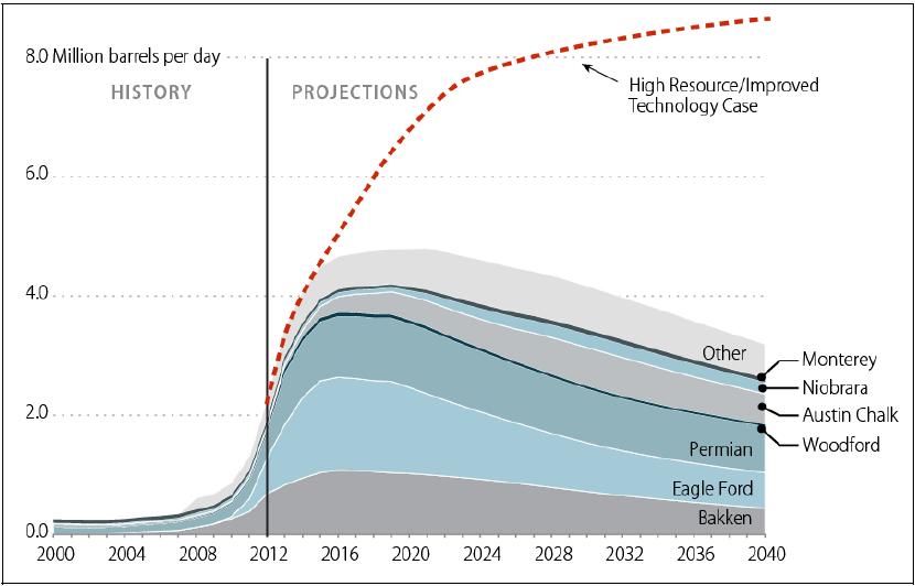 In 2000, approximately 250,000 bbl/d of tight oil was produced in the United States. |59| In 2013, U.S. tight oil production was approximately 3.5 million bbl/day, a nearly 14-fold increase. |60| The Energy Information Administration (EIA) 2014 reference case projects that U.S. tight oil production will continue to increase in the near to medium term and projects that LTO production may peak at 4.8 million bbl/day in 2021. |61| Most of this production is expected to come from three tight oil formations: (1) Eagle Ford in Texas, (2) Permian Basin in Texas, and (3) Bakken in North Dakota (see Figure 2). It is important to note that EIA projections for LTO production are subject to assumptions that are based on currently available information and current policies (e.g., export restrictions). These projections would likely change over time as new information becomes available and if policies are modified. For example, EIA's high resource case projects that tight oil may peak at 8.5 million barrels per day in 2035. |62| Some degree of uncertainty exists in terms of how much LTO might be produced. Future projections, and actual production, may be either higher or lower than those included in EIA's 2014 Annual Energy Outlook.