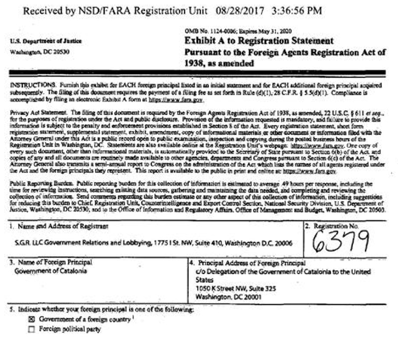 SGR Government Relations Lobbing registró el contrato el 28 de agosto en el Departamento de Justicia para cumplir con la obligación legal de informar de las actividades de lobby. Según el documento, al que ha tenido acceso ABC, SGR se compromete a «trabajar con el Gobierno de Cataluña para apoyar los actuales esfuerzos de comunicación y fortalecer las relaciones entre ambos gobiernos y entre los colectivos empresariales de Cataluña y Estados Unidos».