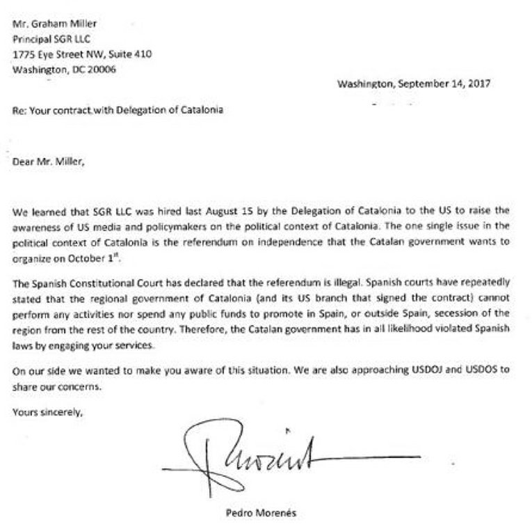 La embajada advierte al despacho del polémico relaciones públicas Jim Courtovich de que «el único tema en el contexto político de Cataluña es el referéndum sobre la independencia que el gobierno catalán quiere organizar el 1 de octubre». A continuación le informa de que «el Tribunal Constitucional español ha declarado que el referéndum es ilegal» y que «los tribunales españoles han reiterado que el gobierno regional de Cataluña (y su sucursal estadounidense que firmó el contrato) no pueden realizar ninguna actividad ni gastar fondos públicos para promover en España, o fuera de España, la secesión de la región del resto del país».