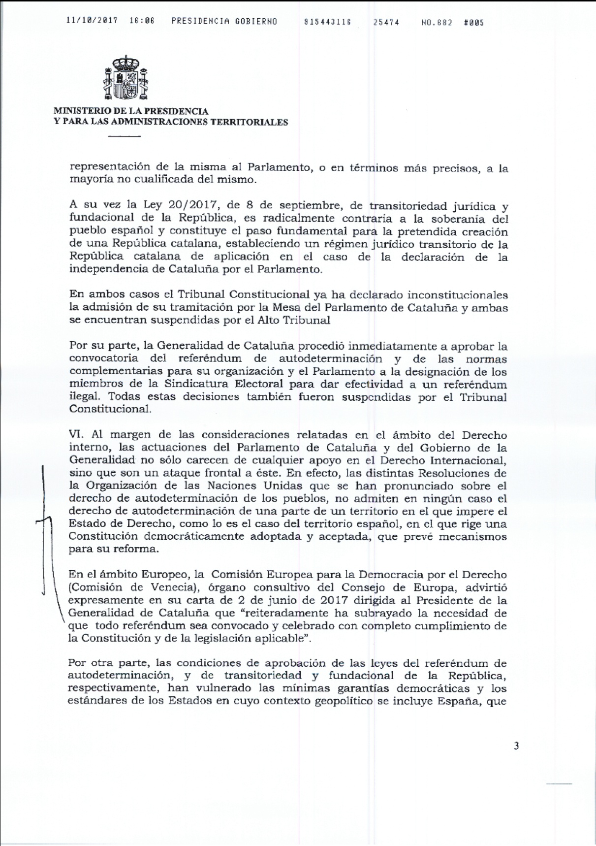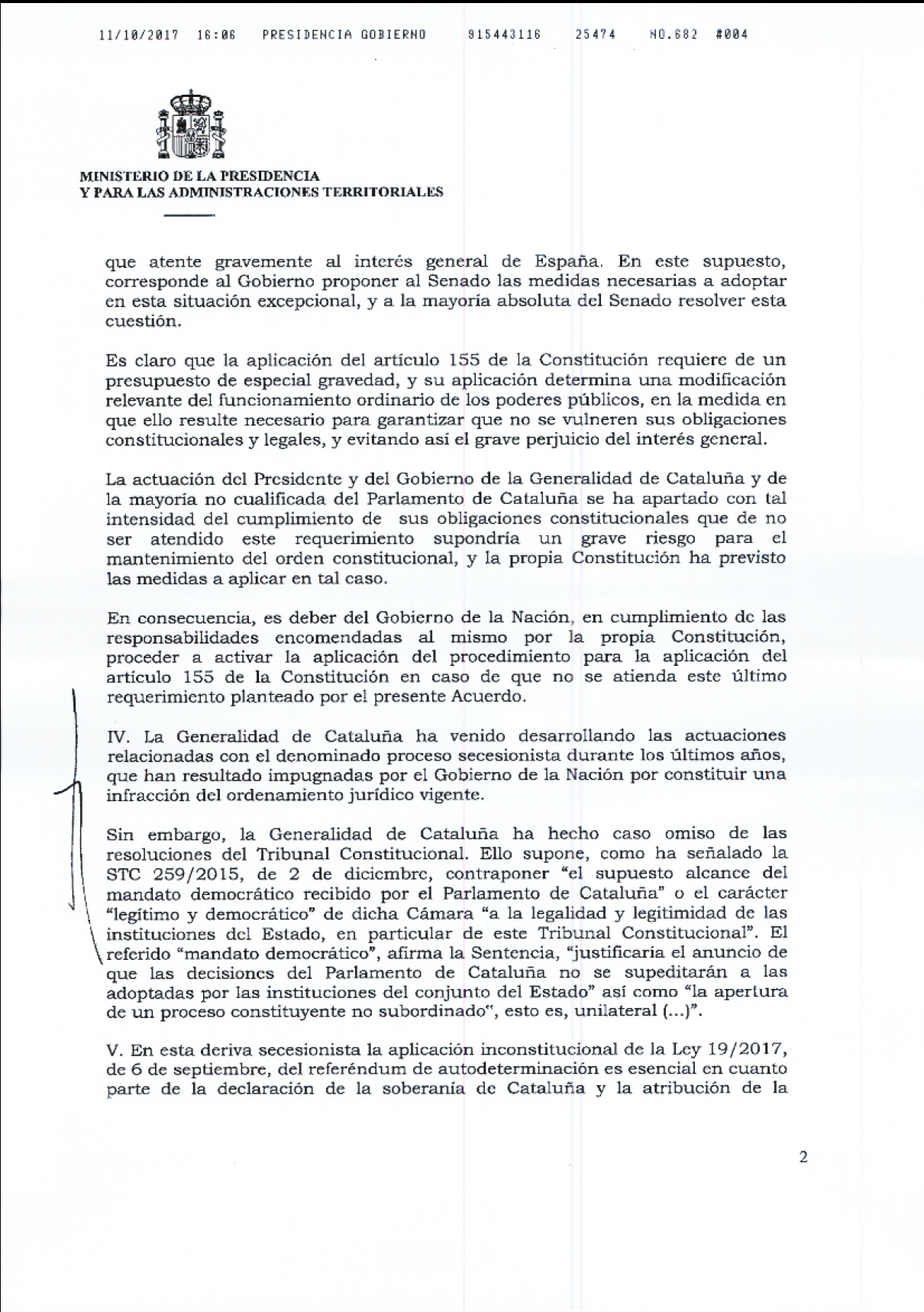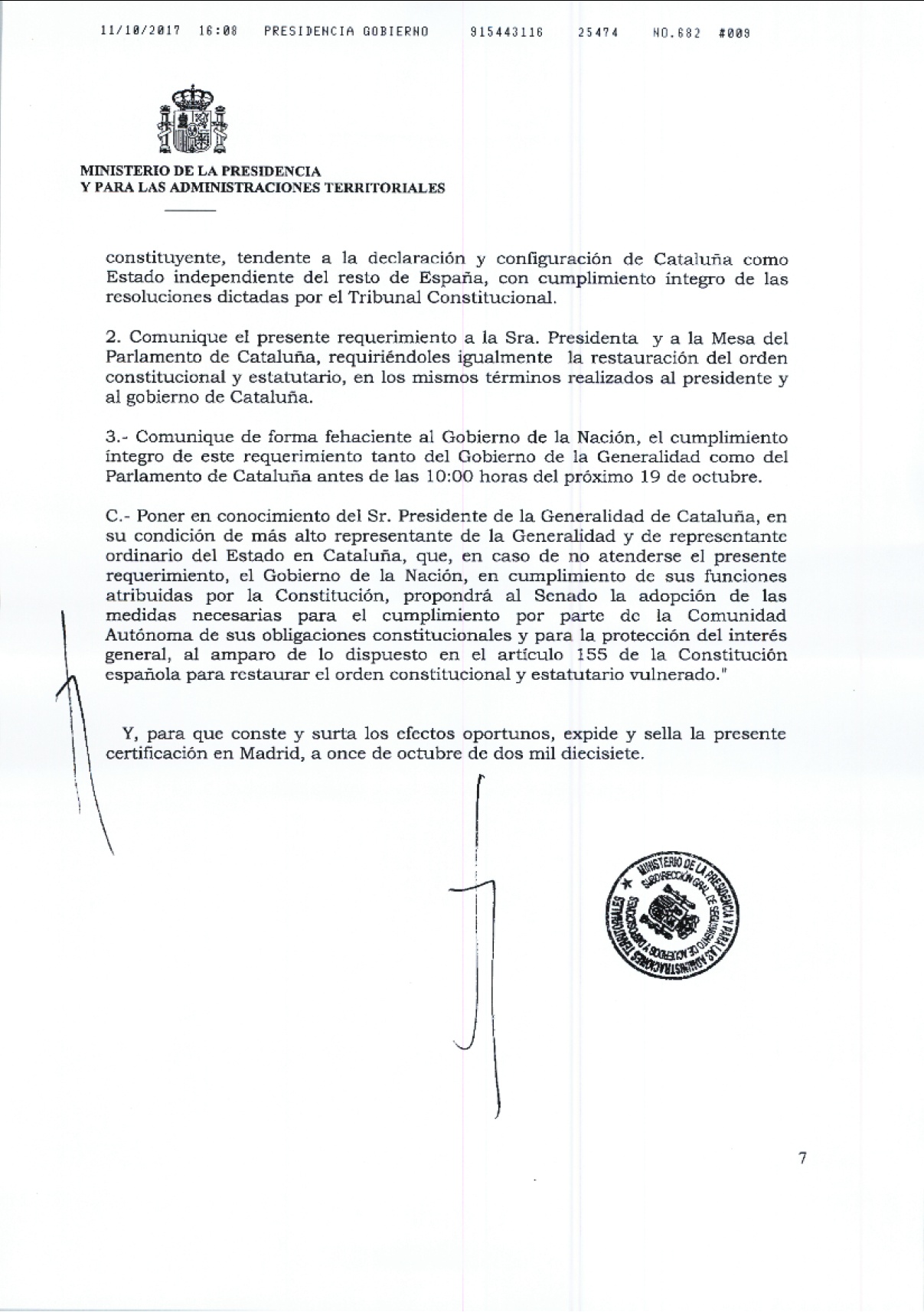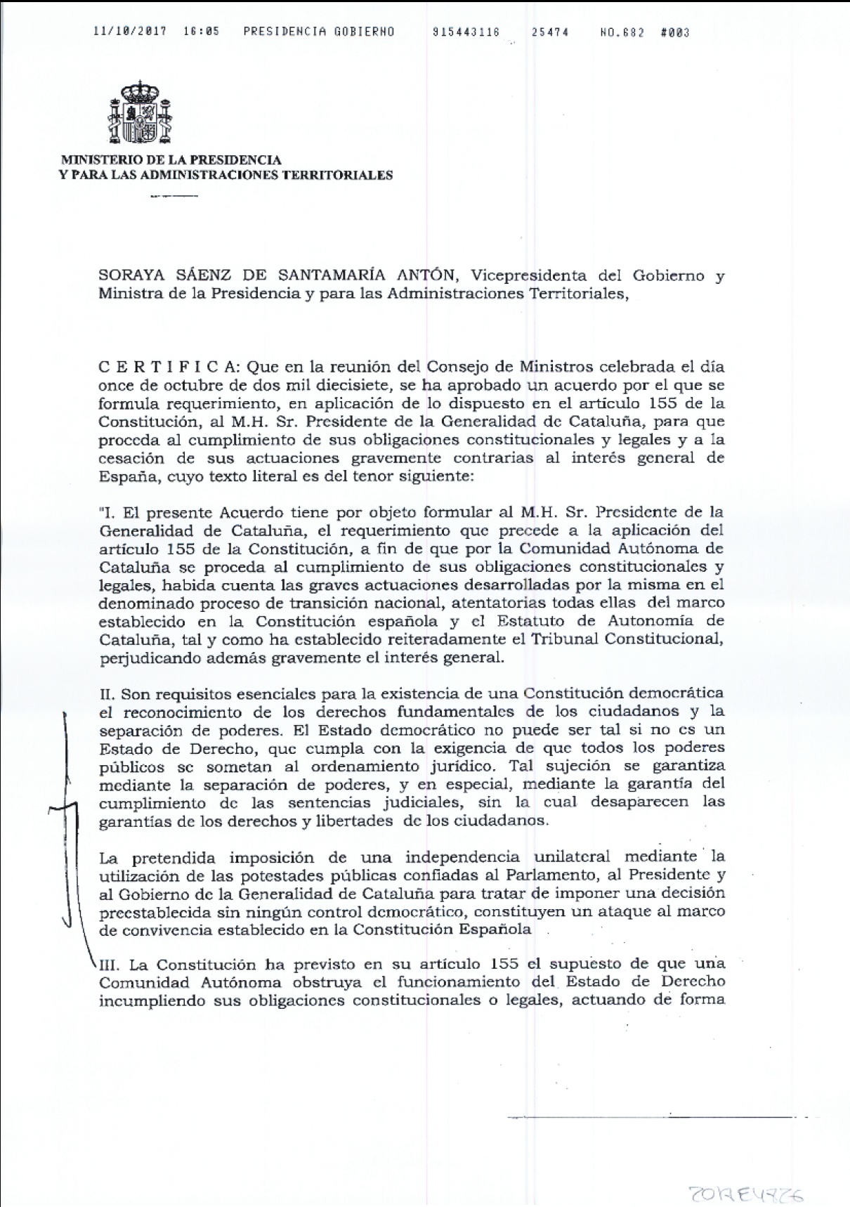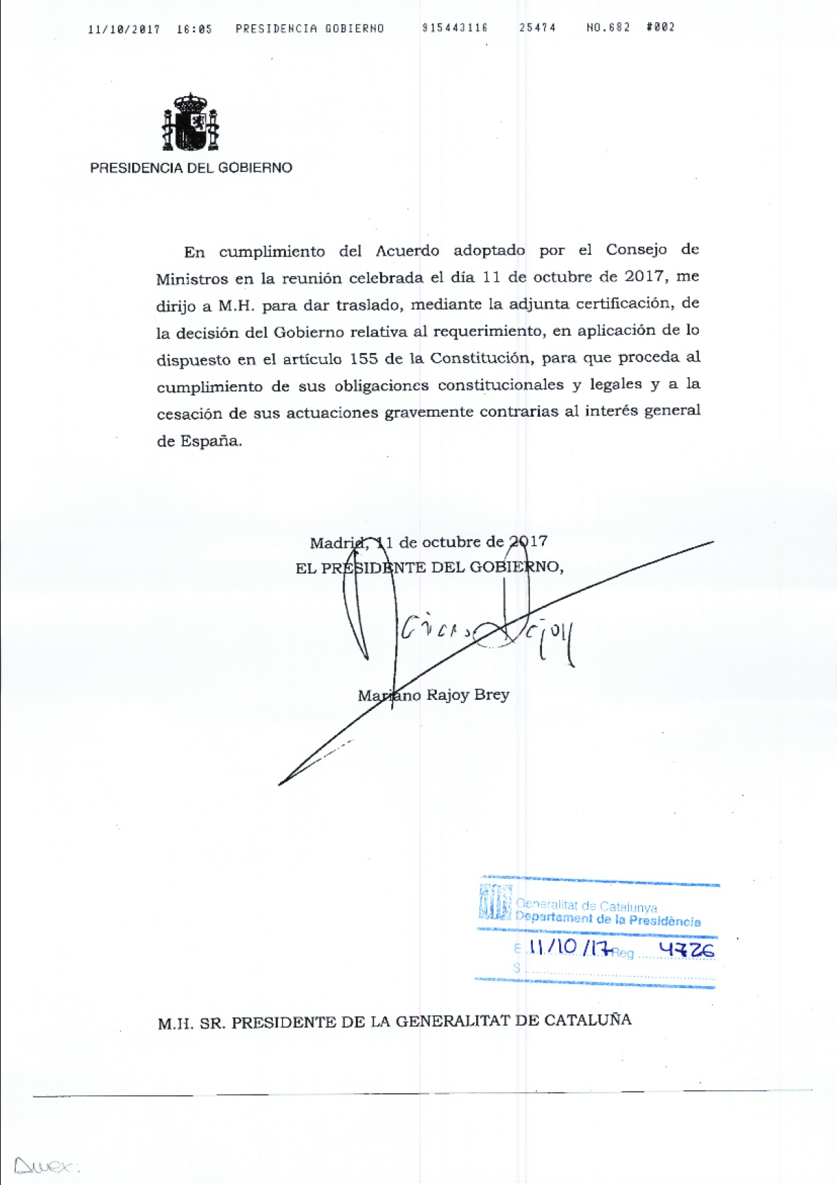 En cumplimiento del Acuerdo adoptado por el Consejo de Ministros en la reunión celebrada el dia 11 de octubre de 2017, me dirijo a M.H. para dar traslado, mediante la adjunta certificación, de la decisión del Gobierno relativa al requerimiento, en aplicación de lo dispuesto en el artículo 155 de la Constitución, para que proceda al cumplimiento de sus obligaciones constitucionales y legales y a la cesación de sus actuaciones gravemente contrarias al interés general de España.