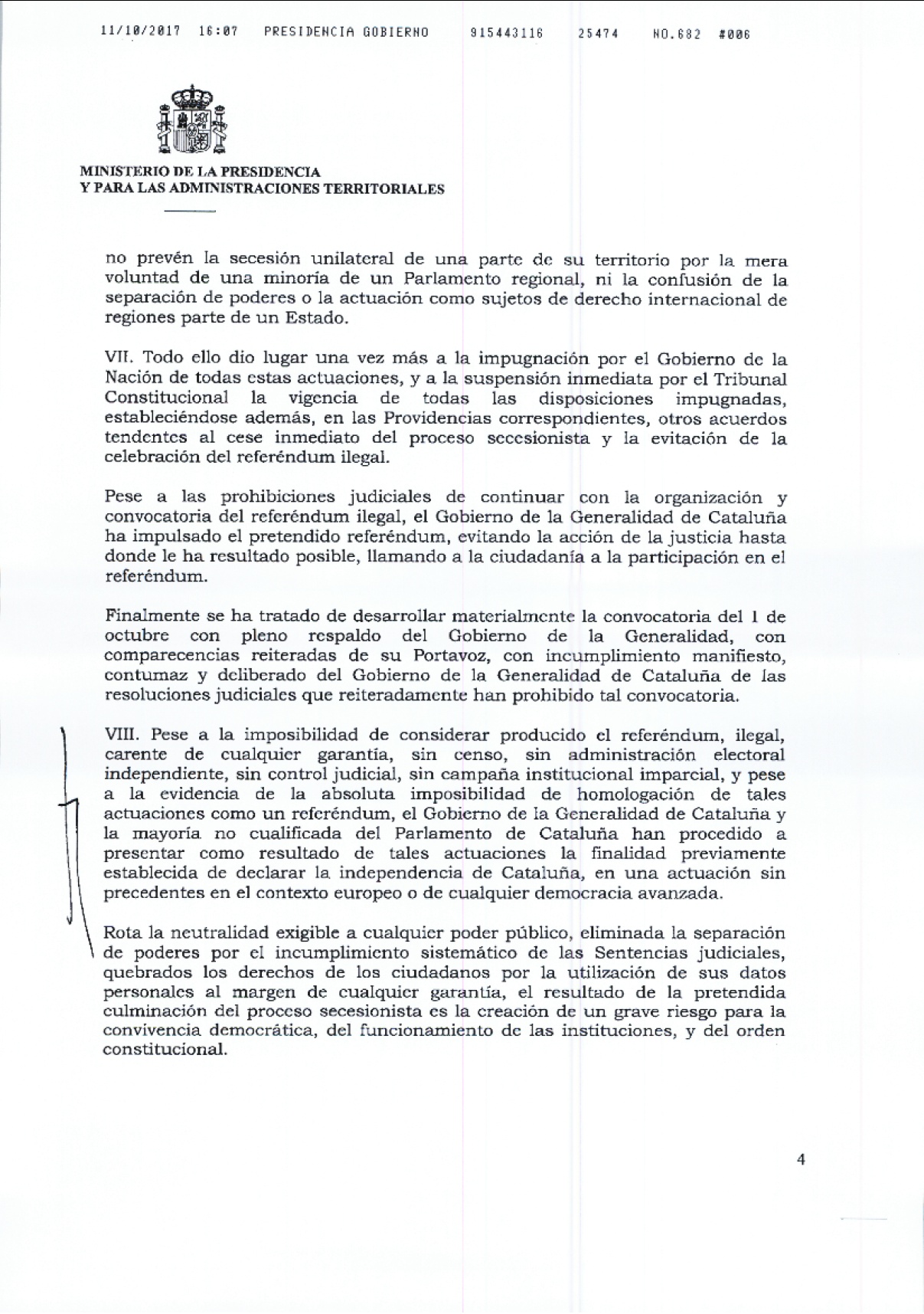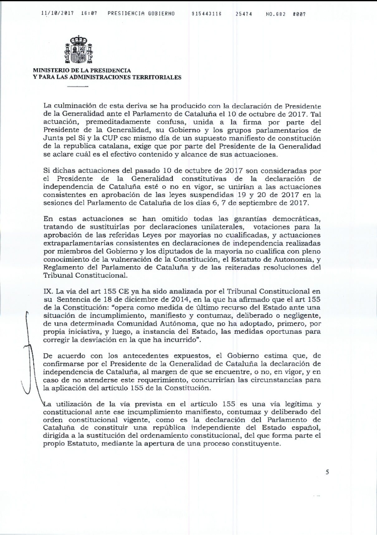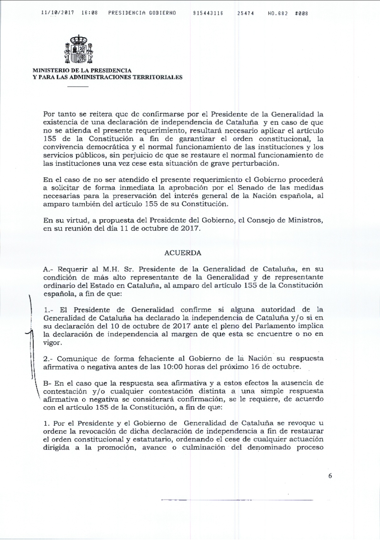 De acuerdo con los antecedentes expuestos, el Gobierno estima que, de confirmarse por el Presidente de la Generalidad de Cataluña la declaración de independencia de Cataluña, al margen de que se encuentre, o no, en vigor, y en caso de no atenderse este requerimiento, concurrirían las circunstancias para la aplicación del articulo 155 de la Constitución.