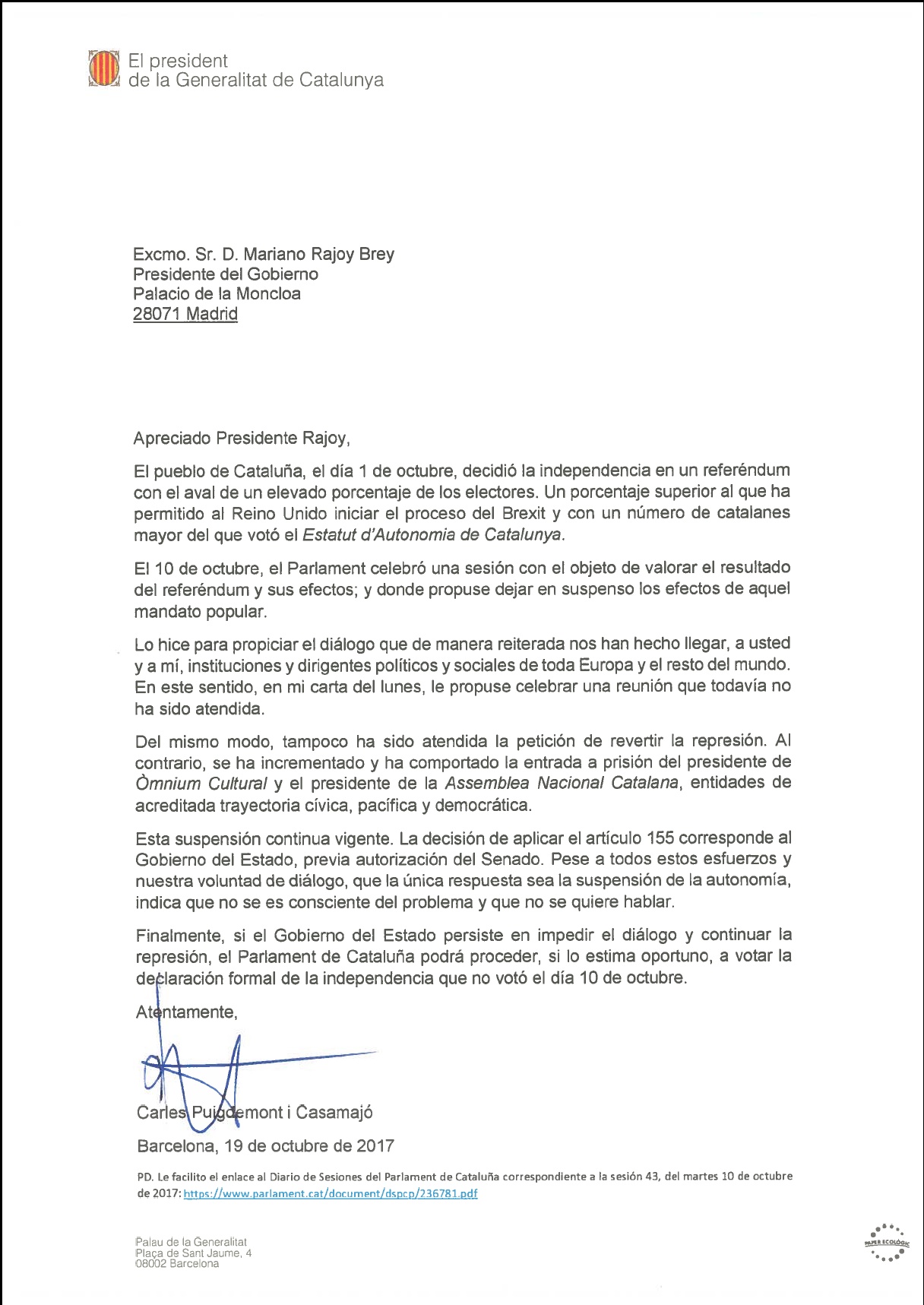 Barcelona, 19 de octubre de 2017PD. Le facilito el enlace al Diario de Sesiones del Parlament de Cataluña correspondiente a la sesión 43, del martes 10 de octubre de 2017: https://www.parlament.cat/document/dspcp/236781.pdf