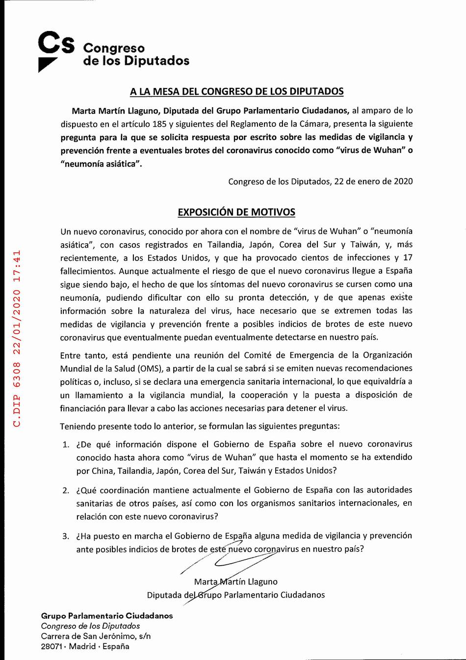 Cuando fue al registro del Congreso de los Diputados para entregar su pregunta, el "virus de Wuhan" o "neumonía asiática" -como Martín lo denominaba- ya había salido de China y había provocado "cientos de infecciones y 17 fallecimientos" en países de sus entorno como Tailandia, Japón, Corea del Sur y Taiwan.