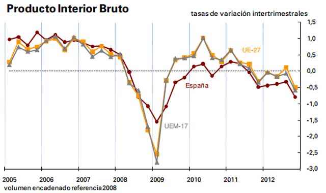 La recesión se agrava. Y lo que es todavía más relevante: no hay síntomas de recuperación. Ni siquiera el sector exterior, que hasta el tercer trimestre de 2012 tiró del carro de la economía, está ahora en condiciones de dar buenas noticias. Básicamente por el empeoramiento de la actividad en los países del entorno económico de España, hacia los que se dirige la mayoría de las exportaciones.