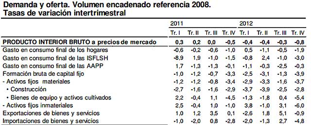 El último trimestre del año pasado, las ventas de bienes y servicios al exterior retrocedieron un 0,9% frente al trimestre anterior. El resultado es, según ha publicado este jueves el INE, un agravamiento de la coyuntura. Hasta el extremo de que la economía cayó un 0,8% en el último trimestre de 2012, lo que significa que anualizando esa tasa por los cuatros trimestres de un año, eso significa que el ritmo de caída del PIB en estos momentos se sitúa en el -3,2%. Desde la Gran Recesión de 2009 no se observaban datos tan adversos. En el conjunto del año, el retroceso del PIB fue del -1,4%, en línea con lo estimado por el Gobierno.