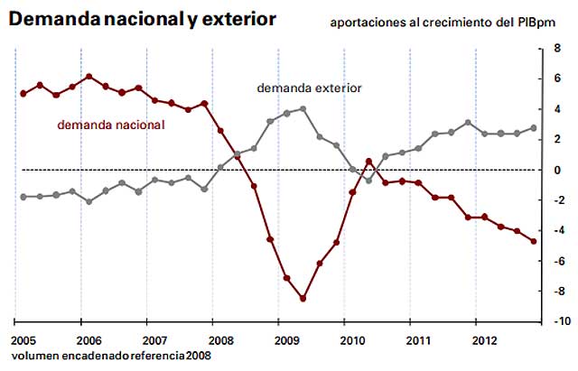 La causa de este comportamiento de la economía tiene que ver con la evolución de la demanda nacional (consumo privado, público e inversiones) que ha restado 4,7 puntos al crecimiento económico. Esta aportación negativa ha sido compensada en parte por el sector exterior, aunque más en concreto por el desplome de las importaciones (-4,8%). La demanda externa, en concreto, ha aportado 2,8 puntos de crecimiento gracias a la contracción del consumo, que ha hundido las compras del exterior.