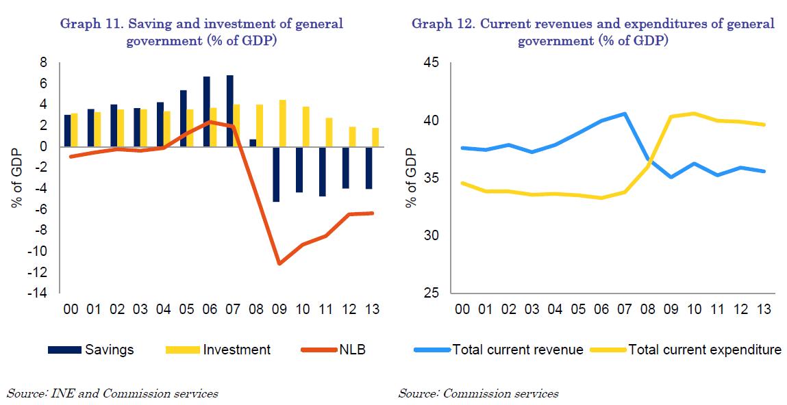 Public sector developments have mirror-imaged those in the private sector. The general government net borrowing position increased in the boom years (with investment less than saving), thus offsetting to some extent the debt accumulation in the private sector (Graph 11). The combination of a steady appreciation of the real effective exchange rate, the reduction of the risk premia and the increase in population in Spain was supportive of a demand-based growth model, highly rich in taxes. According to Martinez-Mongay et al. (2007), about 75% of the increase in tax revenues observed between 1995 and 2006 could have been transitory in nature. Booming domestic economy provided a steady stream of government revenues, recording a particularly steep increase in the tax revenues related to the housing market and private consumption (such as VAT but also corporate taxes). However, during the boom period, the government expenditures also increased significantly, and, as a result the government savings increased at a slower pace than the growth of its revenues (Graph 12). Indeed, as demonstrated by recent developments in public finance, the net lending position of the government proved insufficient to accommodate the disappearance of the extraordinary revenues on which this position was based. As a result, the government balance deteriorated rapidly from 2008 onwards as the government stepped in to support the domestic demand and economic growth in the context of significant private sector deleveraging. That led to the emergence of large government deficits and has significantly increased the public debt level. Despite the on-going fiscal consolidation, public debt is expected to further increase and reach close to 90% of GDP by 2013, according to the Commission Services' 2012 Spring Forecast (see also Section 2.1 of the Commission staff working document: Assessment of the 2012 national reform programme and stability programme for Spain (SWD 2012).. One of the important effects of increasing fiscal deficits and growing public debt has been a significant increase in Spanish risk premia demonstrated by a widening of the spread between Spanish and German government bond yields. This increasing risk premia may also impact the real economy, mostly through the financial sector (i.e. lending conditions for households and non-financial corporations).