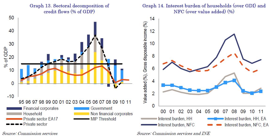 However, it was not only the credit associated with construction that rose sharply in the period of expansion. Credit to other productive activities and to household consumption also experienced a boom, with an average growth rate of 12% between 1997 and 2007. As a result, private sector debt rose appreciably. Specifically, it reached 227% of GDP in 2010, well above the threshold of the MIP scoreboard (160%).