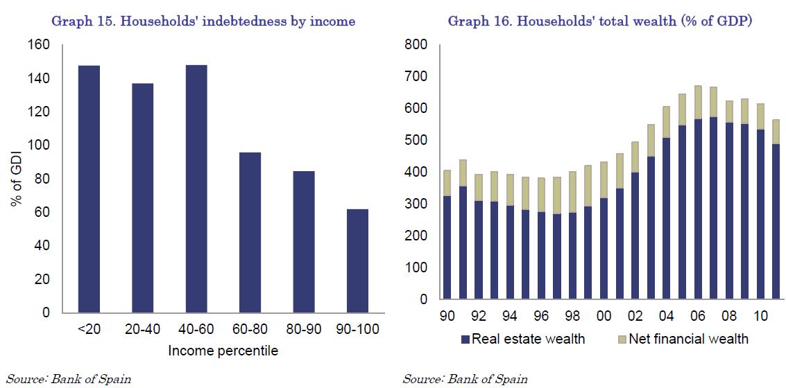 - House prices continue to fall in Spain. The bursting of the housing bubble exposed a significant oversupply of new housing, leading to an accumulation of a large stock of unsold houses. This - together with the selling pressures being exerted on banks by the new bank regulation measures with respect to their real estate repossessions - continues to exert downward pressure on house prices with potential adverse effects on private consumption and financial stability.