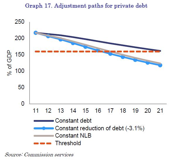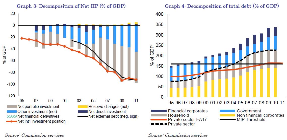 - Large accumulated private sector debt is a source of concern, especially with regard to the real estate and construction sectors. The size and scope of the necessary deleveraging implies subdued domestic demand in the medium-term with significant downside risks related to the high vulnerability of the private sector to interest rates increases associated with widening credit risk spreads. Consequently, economic growth is expected to be weak, with adverse implications for the debt repayment capacity of households and non-financial corporations. In this context, the potential risks of negative spill-overs to the financial sector are also pertinent. In addition, the reduction of private debt is a necessary condition for reducing external debt.