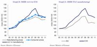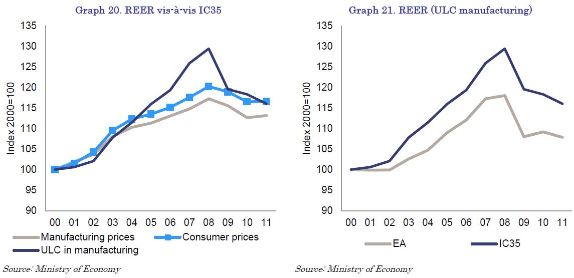 12. Measuring price competitiveness of an economy is not straightforward. It depends on the definition of the real effective exchange rate used (REER) (in particular, the type of deflator used) and on the selection of the benchmark countries. Three commonly used deflators include economy-wide price deflator (i.e. HICP), nominal unit labour cost deflator (ULC) and ULC deflator in the manufacturing sector (Manufacturing), which can be used as a proxy for development of the relative prices in the tradable sector. [Back]