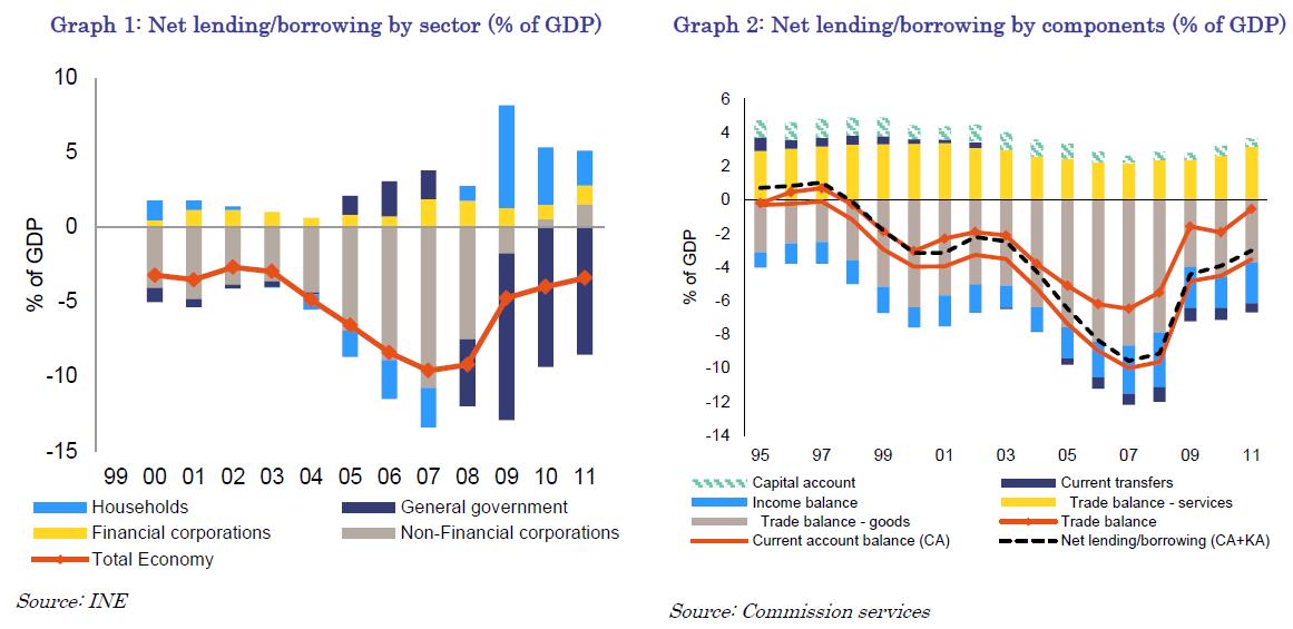 After some stabilisation in 2011, the economy is projected to fall back into recession in 2012. In 2011, the Spanish economy grew by 0.7%, based exclusively on resilient net exports (contributing 2.5 pps. to GDP growth). On the back of very weak domestic demand and tight credit conditions real GDP is expected to contract by 1.8% in 2012 according to the Commission Services' 2012 Spring Forecast. High unemployment, deleveraging of households and non-financial corporations, and the need for fiscal consolidation are weighing heavily on domestic demand. Indeed, the on-going correction of accumulated imbalances will affect domestic demand adversely over the forecast horizon although a gradual improvement is expected starting in 2013. The strong growth contribution of net exports is partly due to this weakness in domestic demand, implying a sharp drop in imports. At the same time, export performance in the wake of the crisis has been strong and is proving to be a major stabilising factor. As a result, the current account deficit has been narrowing and is expected to be close to balance by 2013. In addition, wage growth is expected to be moderate and, in combination with the projected continued strong growth in labour productivity, will further reduce unit labour costs. The inflation differential with the euro area is expected to be negative, leading to some improvement in price competitiveness.
