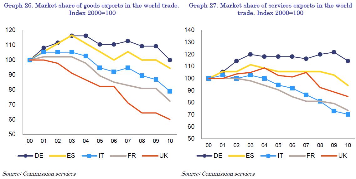 - Spain is in the process of regaining competitiveness. Spain has made important progress in terms of compensating for past losses of its price and cost competitiveness. However, a significant part of this adjustment has been due to cyclical factors, in particular the sharp reduction in employment which implied a strong improvement in measured productivity. A more structural, long-lasting, re-balancing of the economy requires that structural problems that are hampering growth and limiting competitiveness should be tackled. Spain lost some of its global market share for exports of goods and services in the past, mainly reflecting the integration of emerging export-oriented economies. But this decline was less pronounced than in the case of other euro-area countries. Moreover, Spain's export performance has been relatively resilient in the wake of the crisis. However, based on this performance, further improvements in external competitiveness and enlargement of the export base of Spanish economy are of key importance to strengthen the export-orientation of the Spanish economy. This is critical in order to mitigate the negative impact of the on-going deleveraging of the private and public sectors.