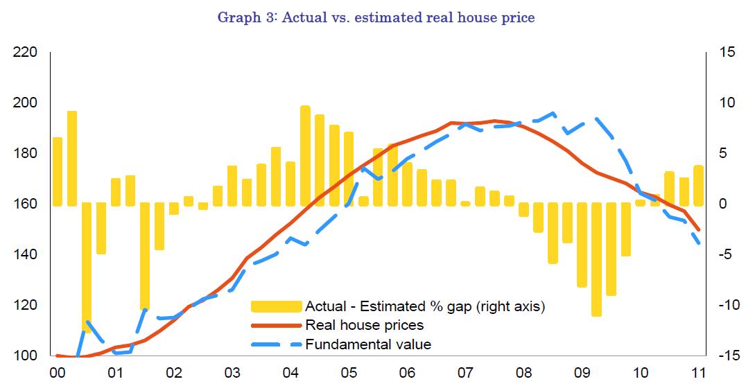 Gauging the future evolution of house prices is not straightforward. International and historical evidence provides only limited guidance on the origin of housing booms and busts and the institutional environment is different among countries and across the time. International evidence shows that house price adjustment takes 5 or 6 years on average. Spain would be in its fourth year of adjustment. Focusing on the Spanish historical evidence, the current house price cycle shows some similarities with the previous cycle but only in its boom phase. However, the bust phase has different characteristics, including a faster adjustment than in the previous cycles, probably due to the financial crisis that is accompanying, and possibly accelerating, the current bust period (see Box 6 for further details). Econometric evidence |26| shows that at present real estate prices are mainly driven by their fundamentals. However, this fact does not mean that there will be no additional adjustments of house prices going forward. To the contrary, the economic recession is pushing some fundamentals related to the house prices, such as real disposable income or credits to house purchasing, to the negative territory. As a result, additional falls of real estate prices should be expected, at least in 2012-2013. However, the exact size of additional fall is uncertain. If the current house price cycle replicates past experiences, real house prices would fall by an additional 10 percentage points. In addition, other reference values, such as the ratio of house value over household's average income or the ratio of profitability of house rent over long-term interest rates, points to an additional adjustment of around 30 pps. In order for the prices to adjust to their pre-boom level (i.e. in 2001) a similar adjustment would be required. Finally, according to the econometric model outlined in Box 6 and considering the expected behaviour of real gross disposable of households as in the Commission Services' 2012 Spring Forecast, an additional fall of around 25% until 2013 could be predicted. Independently of the specific figure, these estimates show that there is a high probability of additional, significant house price adjustment and, therefore, there are potentially high spillover risks for the real economy and for the financial sector.