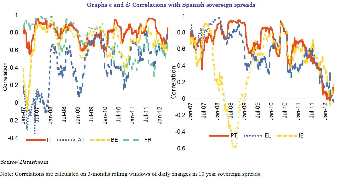 Financial channels of transmission of shocks have gained prominence in the recent years with increasing financial integration. In the case of Spain, two possible financial channels could be identified. First, negative spillovers of Spain could be transmitted through the sovereign debt market. In particular, developments of Spanish sovereign bonds could impact on other euro-area sovereigns due to their increased correlation over time (see Box 2 for a more detailed discussion). In addition, countries characterized by a large exposure of their banking sector to Spain (such as Germany and France) may be more vulnerable to potential negative spillovers from Spain.