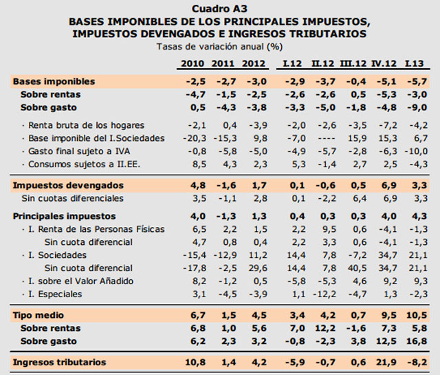 Para hacerse una idea de la evolución de las bases imponibles -el indicador determinante de la capacidad recaudatoria del Estado- hay que tener en cuenta que en 2010 el descenso fue del 2,5%; del 2,7%, en 2011, y del 3%, en 2012, casi la mitad que en el primer trimestre de este año, lo que pone de relieve la intensidad de la crisis. Lejos quedan los tiempos en que las bases imponibles totales (incluyendo todos los impuestos) crecían en tasas de dos dígitos (en 1998 y 2006), y siempre por encima del 5,7% en los últimos 17 años.