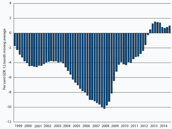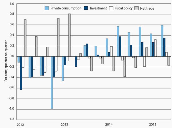 Third, the data for real GDP give a misleading impression of what has happened to activity in the domestic economy. Domestic demand (that is, consumption and investment) is still 12 per cent lower than the pre-crisis peak, and is unlikely to recover that lost ground until 2020 at the earliest (see Chart 4). The gulf between GDP and domestic demand reflects the collapse of imports, which were 15 per cent lower in the second quarter of 2015 relative to the final one of 2007; exports were up 18 per cent over this period.