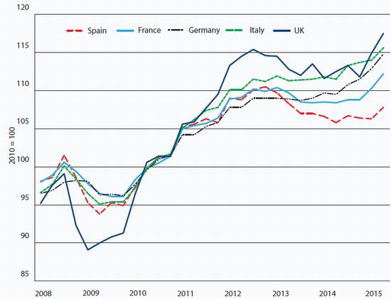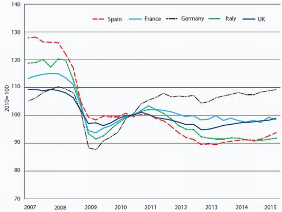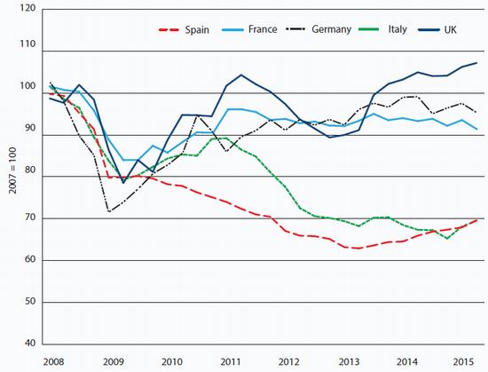 While the rise in exports is good news, the scale of the fall in imports is not, reflecting declining living standards, mass unemployment and (notwithstanding a slight recovery) depressed investment (see Chart 5). Moreover, Spain's relatively strong export performance has not been enough to bring about a recovery in industrial production, which was lower in mid-2015 than it was at the depth of the crisis in 2009 (see Chart 6).