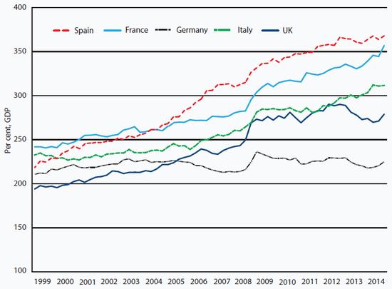 Excluding the financial sector gives a better indication of the weight of debt in an economy. Financial sector indebtedness is largely a function of the size of a country's financial sector. So long as banks are properly capitalised and capital markets firmly regulated, financial sector debt should not exert a drag on economic growth. However, high levels of non-financial, household and government debt combined with low inflation will depress demand. Spain has the highest debt of the big five EU economies once financial sector debt is excluded, and has not achieved any deleveraging at all (see Chart 21).