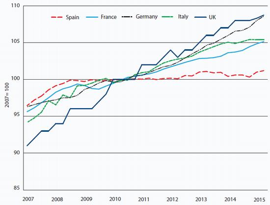 - Spain needs stronger productivity growth if living standards are to converge with those in wealthier EU countries. But there is little sign that investment is switching from lower to higher value-added activities. Most of the jobs created over the last couple of years have comprised poorly-paid service sector employment, especially in tourism.