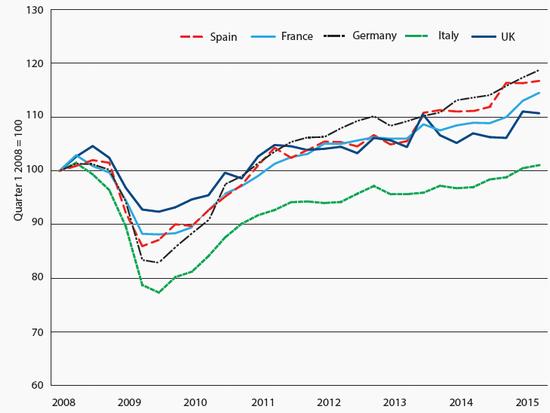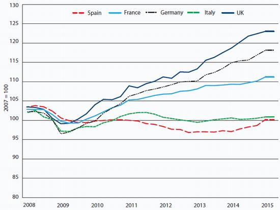 Spain's economy is growing relatively rapidly, but it is doing so from low base. The level of economic activity remains depressed compared to pre-crisis levels: too many commentators are confusing the level of activity with the rate of growth in that activity. Even assuming that the economy expands by 3 per cent in 2015 and 2.5 per cent in 2016, it will not recover its pre-crisis size before 2017 (see Chart 2). By contrast, had the Spanish economy grown by 2 per cent annually since 2008 (that is, at half its rate of expansion between 1999 and 2007), it would be over a fifth larger than it is now.