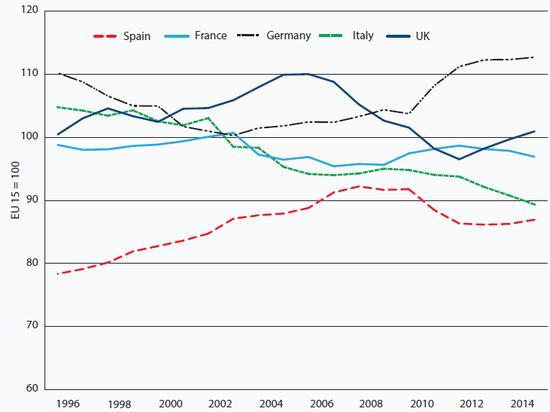 Productivity: Spain requires considerably stronger productivity growth if Spanish living standards are to converge with wealthier EU countries. Stronger productivity relies on capital and labour inputs but also on the efficiency with which capital and labour are employed: so-called total factor productivity. The high real cost of borrowing combined with the burden of debt and weak consumption threaten to be a drag on investment. And there is little to suggest that investment is switching from lower-value production into higher value-added production, with the associated productivity gains. A high proportion of the jobs created over the last couple of years have been poorly-paid service sector employment, especially in tourism. Large numbers of educated young Spaniards are continuing to move abroad in search of work. If these workers eventually return to Spain, the long-term impact on Spanish productivity could be limited, or even positive, depending on the skills and experience they accumulate abroad. However, if those currently moving abroad stay there, Spain will suffer permanent damage to its economy.