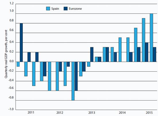Spain's economy has now expanded for eight consecutive quarters, steadily gaining momentum and easily outperforming the rest of the currency union (see Chart 1). Economic growth topped 3 per cent in the year to the middle of 2015. Employment grew by a similar margin, which together with rising real wages, underpinned robust consumption. Investment in machinery and equipment also picked up strongly, as business confidence gradually returned. These are good numbers, but they are rather misleading. And there is no evidence that they are the result of austerity and not much evidence that they are the product of structural reforms.
