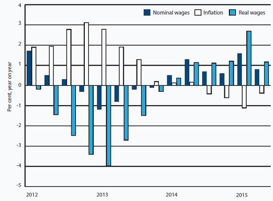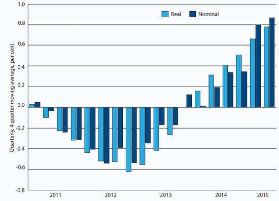 The return to real wage growth, which has provided the principal boost to economic activity over the last year, almost certainly reflects temporary factors (see Charts 8 and 9). While growth in nominal wages has picked up since the beginning of 2014, the return to positive growth in real wages also reflects the decline in inflation, which has turned negative. It is likely that real wage growth will prove short-lived: nominal wage settlements will probably fall as wage negotiators adjust to much lower inflation. Indeed, there are indications that this is already happening, with the rate of growth in nominal wages slowing sharply in the second quarter of 2015.