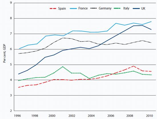 Construction: Booming construction sector activity was a major factor behind Spain's rapid economic growth before the crisis, and this boom left the country with a long and nasty hangover. Construction accounted for almost 12 per cent of GDP by 2006 compared with around half that in France or the UK. Since then, Spanish construction activity has fallen to 5-6 per cent of GDP Although the construction sector appears to have bottomed out, there is little reason to expect anything but stagnation given Spain's demographics. There is still a large overhang of empty homes, some of which are being demolished but many of which will continue to weigh on the market. Infrastructure spending will also remain weak, partly as a result the fiscal pressures facing the Spanish government, but also because Spain's physical infrastructure is in good shape following heavy investment in the 20 years leading up to the crisis.