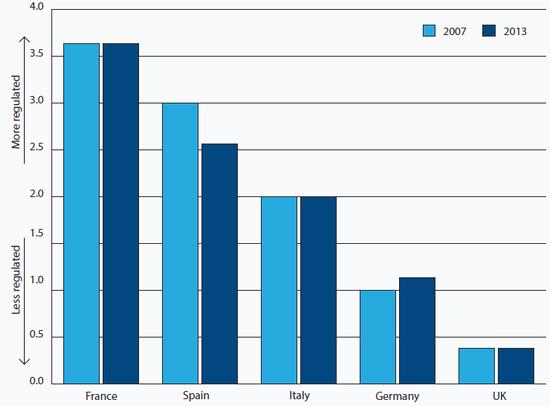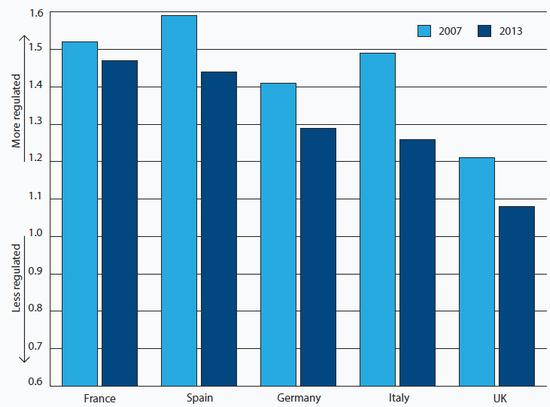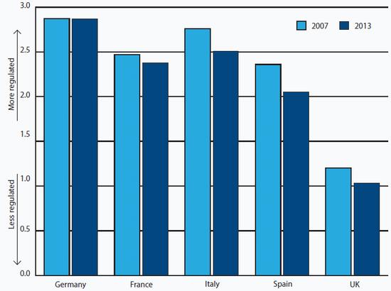 Another oft-cited reason for Spain's relatively strong export performance is that Spanish firms are reaping the rewards of structural reforms, which have boosted the competitiveness of the Spanish economy and hence its exports. The OECD compiles indices of the levels of market regulation in developed countries. These indices for product and labour market regulation are not perfect, but they are rigorous and comparative. According to the OECD's index, Spain's markets for goods and services are freer than they were before the crisis, suggesting that structural reforms have been effective (see Chart 11). But Italy has made greater progress and from a more favourable starting point. Incidentally, the OECD calculates that Italy now has freer markets for good and services than Germany, the implicit benchmark for economic performance in the eurozone.